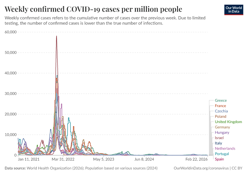 “Data Page: Weekly confirmed COVID-19 cases per million people”, part of the following publication: Edouard Mathieu, Hannah Ritchie, Lucas Rodés-Guirao, Cameron Appel, Daniel Gavrilov, Charlie Giattino, Joe Hasell, Bobbie Macdonald, Saloni Dattani, Diana Beltekian, Esteban Ortiz-Ospina, and Max Roser (2020) - “COVID-19 Pandemic”. Data adapted from World Health Organization, Various sources. Retrieved from https://archive.ourworldindata.org/20260218-063338/grapher/weekly-covid-cases-per-million-people.html [online resource] (archived on February 18, 2026).How to cite this data