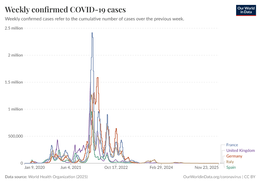 World Health Organization (2025) – processed by Our World in Data. “Weekly confirmed COVID-19 cases” [dataset]. World Health Organization, “COVID-19 Dashboard WHO COVID-19 Dashboard - Daily cases and deaths” [original data]. Retrieved December 13, 2025 from https://archive.ourworldindata.org/20251213-063349/grapher/weekly-covid-cases.html (archived on December 13, 2025).