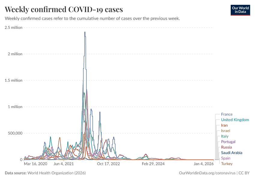 World Health Organization (2026) – processed by Our World in Data. “Weekly confirmed COVID-19 cases” [dataset]. World Health Organization, “COVID-19 Dashboard WHO COVID-19 Dashboard - Daily cases and deaths” [original data]. Retrieved January 27, 2026 from https://archive.ourworldindata.org/20260126-094752/grapher/weekly-covid-cases.html (archived on January 26, 2026).