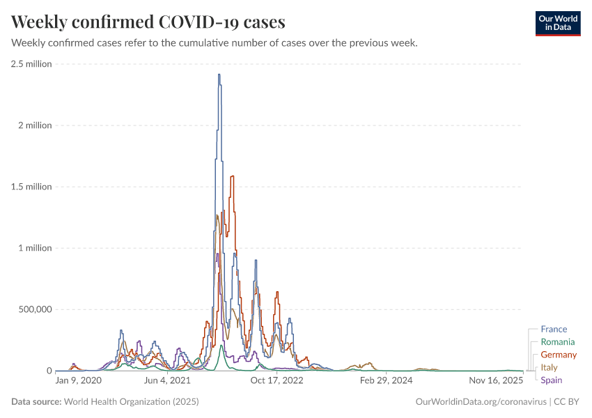 World Health Organization (2025) – processed by Our World in Data. “Weekly confirmed COVID-19 cases” [dataset]. World Health Organization, “COVID-19 Dashboard WHO COVID-19 Dashboard - Daily cases and deaths” [original data]. Retrieved December 7, 2025 from https://archive.ourworldindata.org/20251207-063327/grapher/weekly-covid-cases.html (archived on December 7, 2025).