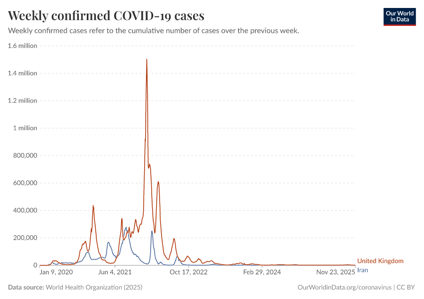 World Health Organization (2025) – processed by Our World in Data. “Weekly confirmed COVID-19 cases” [dataset]. World Health Organization, “COVID-19 Dashboard WHO COVID-19 Dashboard - Daily cases and deaths” [original data]. Retrieved December 15, 2025 from https://archive.ourworldindata.org/20251215-063346/grapher/weekly-covid-cases.html (archived on December 15, 2025).