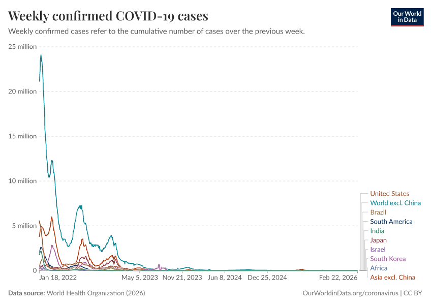 World Health Organization (2026) – processed by Our World in Data. “Weekly confirmed COVID-19 cases” [dataset]. World Health Organization, “COVID-19 Dashboard WHO COVID-19 Dashboard - Daily cases and deaths” [original data]. Retrieved April 17, 2026 from https://archive.ourworldindata.org/20260417-112857/grapher/weekly-covid-cases.html (archived on April 17, 2026).Download