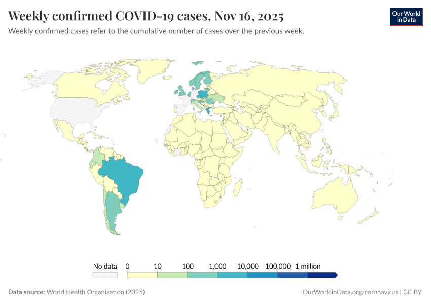 World Health Organization (2025) – processed by Our World in Data. “Weekly confirmed COVID-19 cases” [dataset]. World Health Organization, “COVID-19 Dashboard WHO COVID-19 Dashboard - Daily cases and deaths” [original data]. Retrieved December 5, 2025 from https://archive.ourworldindata.org/20251205-063407/grapher/weekly-covid-cases.html (archived on December 5, 2025).