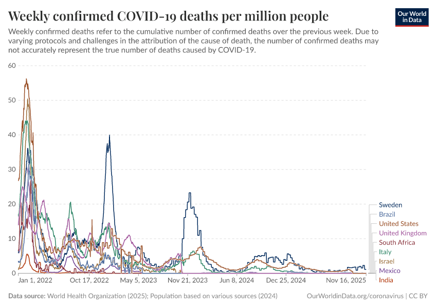 “Data Page: Weekly confirmed COVID-19 deaths per million people”, part of the following publication: Edouard Mathieu, Hannah Ritchie, Lucas Rodés-Guirao, Cameron Appel, Daniel Gavrilov, Charlie Giattino, Joe Hasell, Bobbie Macdonald, Saloni Dattani, Diana Beltekian, Esteban Ortiz-Ospina, and Max Roser (2020) - “COVID-19 Pandemic”. Data adapted from World Health Organization, Various sources. Retrieved from https://archive.ourworldindata.org/20251206-063317/grapher/weekly-covid-deaths-per-million-people.html [online resource] (archived on December 6, 2025).