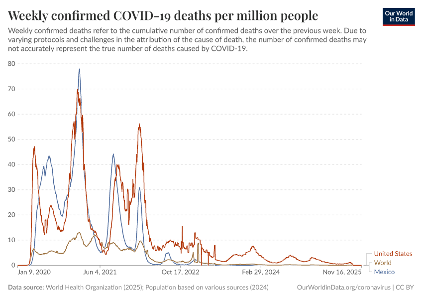 “Data Page: Weekly confirmed COVID-19 deaths per million people”, part of the following publication: Edouard Mathieu, Hannah Ritchie, Lucas Rodés-Guirao, Cameron Appel, Daniel Gavrilov, Charlie Giattino, Joe Hasell, Bobbie Macdonald, Saloni Dattani, Diana Beltekian, Esteban Ortiz-Ospina, and Max Roser (2020) - “COVID-19 Pandemic”. Data adapted from World Health Organization, Various sources. Retrieved from https://archive.ourworldindata.org/20251204-063323/grapher/weekly-covid-deaths-per-million-people.html [online resource] (archived on December 4, 2025).