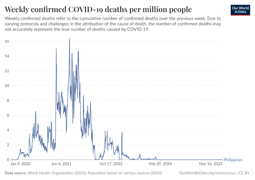 World Health Organization (2025); Population based on various sources (2024) – with major processing by Our World in Data. “Weekly confirmed COVID-19 deaths per million people” [dataset]. World Health Organization, “COVID-19 Dashboard WHO COVID-19 Dashboard - Daily cases and deaths”; Various sources, “Population” [original data]. Retrieved December 8, 2025 from https://archive.ourworldindata.org/20251208-090413/grapher/weekly-covid-deaths-per-million-people.html (archived on December 8, 2025).