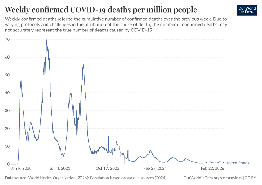 “Data Page: Weekly confirmed COVID-19 deaths per million people”, part of the following publication: Edouard Mathieu, Hannah Ritchie, Lucas Rodés-Guirao, Cameron Appel, Daniel Gavrilov, Charlie Giattino, Joe Hasell, Bobbie Macdonald, Saloni Dattani, Diana Beltekian, Esteban Ortiz-Ospina, and Max Roser (2020) - “COVID-19 Pandemic”. Data adapted from World Health Organization, Various sources. Retrieved from https://archive.ourworldindata.org/20260418-064603/grapher/weekly-covid-deaths-per-million-people.html [online resource] (archived on April 18, 2026).How to cite this data