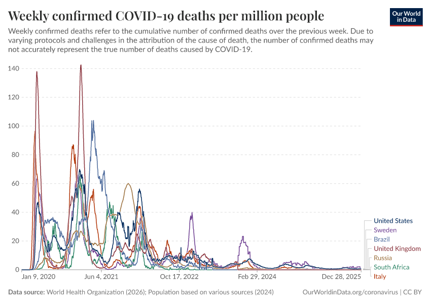 “Data Page: Weekly confirmed COVID-19 deaths per million people”, part of the following publication: Edouard Mathieu, Hannah Ritchie, Lucas Rodés-Guirao, Cameron Appel, Daniel Gavrilov, Charlie Giattino, Joe Hasell, Bobbie Macdonald, Saloni Dattani, Diana Beltekian, Esteban Ortiz-Ospina, and Max Roser (2020) - “COVID-19 Pandemic”. Data adapted from World Health Organization, Various sources. Retrieved from https://archive.ourworldindata.org/20260114-063314/grapher/weekly-covid-deaths-per-million-people.html [online resource] (archived on January 14, 2026).
