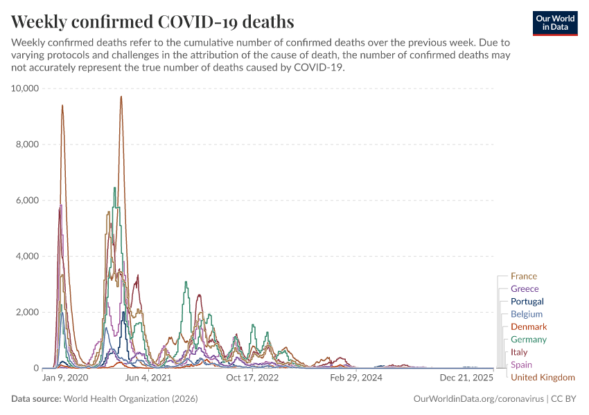 “Data Page: Weekly confirmed COVID-19 deaths”, part of the following publication: Edouard Mathieu, Hannah Ritchie, Lucas Rodés-Guirao, Cameron Appel, Daniel Gavrilov, Charlie Giattino, Joe Hasell, Bobbie Macdonald, Saloni Dattani, Diana Beltekian, Esteban Ortiz-Ospina, and Max Roser (2020) - “COVID-19 Pandemic”. Data adapted from World Health Organization. Retrieved from https://archive.ourworldindata.org/20260111-063230/grapher/weekly-covid-deaths.html [online resource] (archived on January 11, 2026).