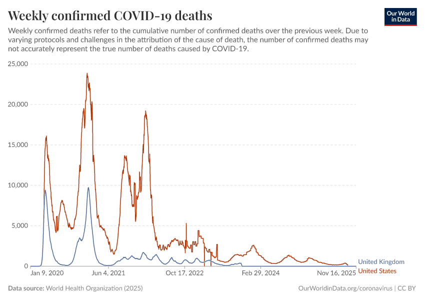 World Health Organization (2025) – processed by Our World in Data. “Weekly confirmed COVID-19 deaths” [dataset]. World Health Organization, “COVID-19 Dashboard WHO COVID-19 Dashboard - Daily cases and deaths” [original data]. Retrieved December 10, 2025 from https://archive.ourworldindata.org/20251209-063408/grapher/weekly-covid-deaths.html (archived on December 9, 2025).