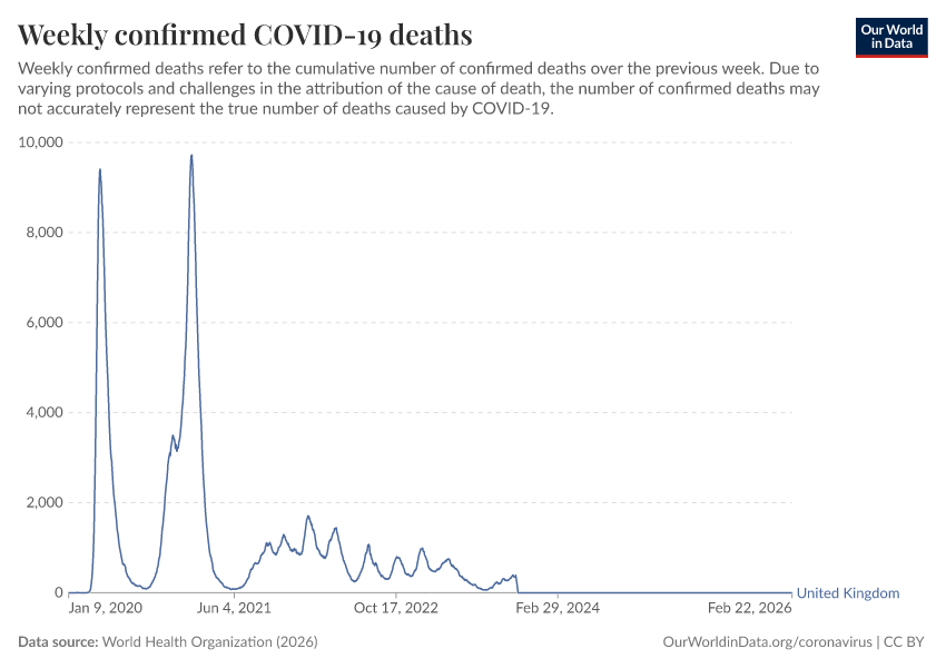“Data Page: Weekly confirmed COVID-19 deaths”, part of the following publication: Edouard Mathieu, Hannah Ritchie, Lucas Rodés-Guirao, Cameron Appel, Daniel Gavrilov, Charlie Giattino, Joe Hasell, Bobbie Macdonald, Saloni Dattani, Diana Beltekian, Esteban Ortiz-Ospina, and Max Roser (2020) - “COVID-19 Pandemic”. Data adapted from World Health Organization. Retrieved from https://archive.ourworldindata.org/20260401-063313/grapher/weekly-covid-deaths.html [online resource] (archived on April 1, 2026).