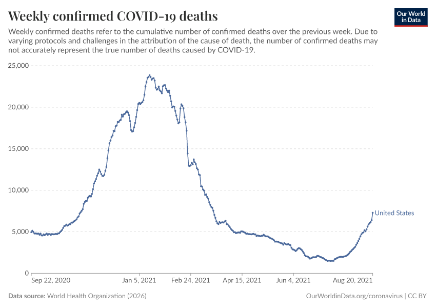 “Data Page: Weekly confirmed COVID-19 deaths”, part of the following publication: Edouard Mathieu, Hannah Ritchie, Lucas Rodés-Guirao, Cameron Appel, Daniel Gavrilov, Charlie Giattino, Joe Hasell, Bobbie Macdonald, Saloni Dattani, Diana Beltekian, Esteban Ortiz-Ospina, and Max Roser (2020) - “COVID-19 Pandemic”. Data adapted from World Health Organization. Retrieved from https://archive.ourworldindata.org/20260102-063318/grapher/weekly-covid-deaths.html [online resource] (archived on January 2, 2026).How to cite this data