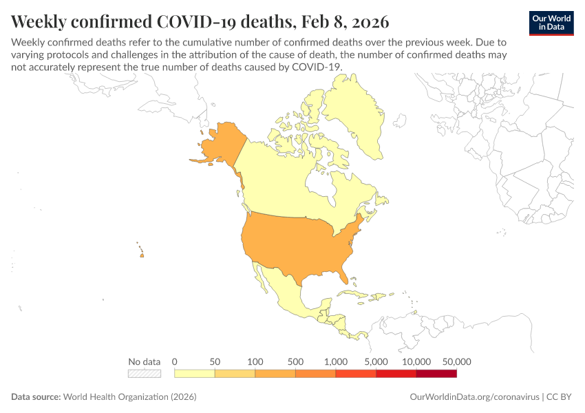 “Data Page: Weekly confirmed COVID-19 deaths”, part of the following publication: Edouard Mathieu, Hannah Ritchie, Lucas Rodés-Guirao, Cameron Appel, Daniel Gavrilov, Charlie Giattino, Joe Hasell, Bobbie Macdonald, Saloni Dattani, Diana Beltekian, Esteban Ortiz-Ospina, and Max Roser (2020) - “COVID-19 Pandemic”. Data adapted from World Health Organization. Retrieved from https://archive.ourworldindata.org/20260227-063355/grapher/weekly-covid-deaths.html [online resource] (archived on February 27, 2026).How to cite this data