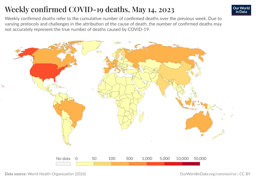 “Data Page: Weekly confirmed COVID-19 deaths”, part of the following publication: Edouard Mathieu, Hannah Ritchie, Lucas Rodés-Guirao, Cameron Appel, Daniel Gavrilov, Charlie Giattino, Joe Hasell, Bobbie Macdonald, Saloni Dattani, Diana Beltekian, Esteban Ortiz-Ospina, and Max Roser (2020) - “COVID-19 Pandemic”. Data adapted from World Health Organization. Retrieved from https://archive.ourworldindata.org/20260102-063318/grapher/weekly-covid-deaths.html [online resource] (archived on January 2, 2026).How to cite this data