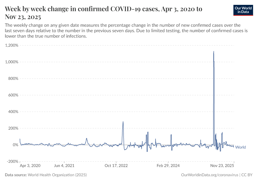 World Health Organization (2025) – processed by Our World in Data. “Week by week change in confirmed COVID-19 cases” [dataset]. World Health Organization, “COVID-19 Dashboard WHO COVID-19 Dashboard - Daily cases and deaths” [original data]. Retrieved December 23, 2025 from https://archive.ourworldindata.org/20251223-063440/grapher/weekly-growth-covid-cases.html (archived on December 23, 2025).