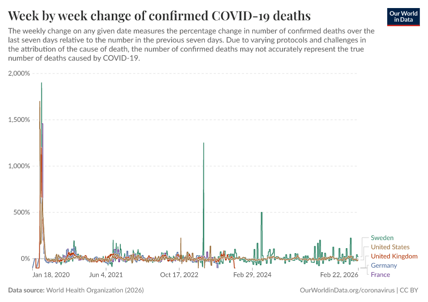 “Data Page: Week by week change of confirmed COVID-19 deaths”, part of the following publication: Edouard Mathieu, Hannah Ritchie, Lucas Rodés-Guirao, Cameron Appel, Daniel Gavrilov, Charlie Giattino, Joe Hasell, Bobbie Macdonald, Saloni Dattani, Diana Beltekian, Esteban Ortiz-Ospina, and Max Roser (2020) - “COVID-19 Pandemic”. Data adapted from World Health Organization. Retrieved from https://archive.ourworldindata.org/20260406-063350/grapher/weekly-growth-covid-deaths.html [online resource] (archived on April 6, 2026).
