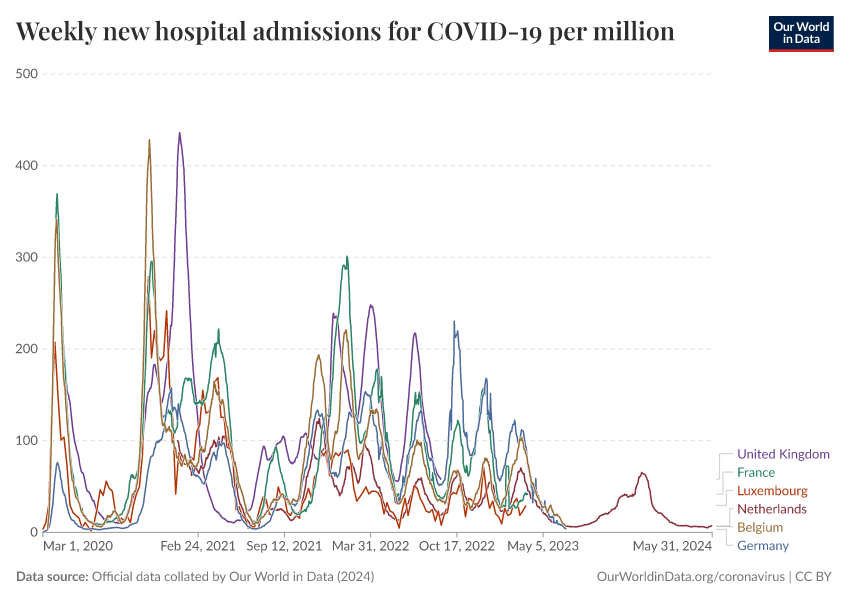 “Data Page: Weekly new hospital admissions for COVID-19 per million”, part of the following publication: Edouard Mathieu, Hannah Ritchie, Lucas Rodés-Guirao, Cameron Appel, Daniel Gavrilov, Charlie Giattino, Joe Hasell, Bobbie Macdonald, Saloni Dattani, Diana Beltekian, Esteban Ortiz-Ospina, and Max Roser (2020) - “COVID-19 Pandemic”. Data adapted from Official data collated by Our World in Data. Retrieved from https://archive.ourworldindata.org/20250909-093708/grapher/weekly-hospital-admissions-covid-per-million.html [online resource] (archived on September 9, 2025).