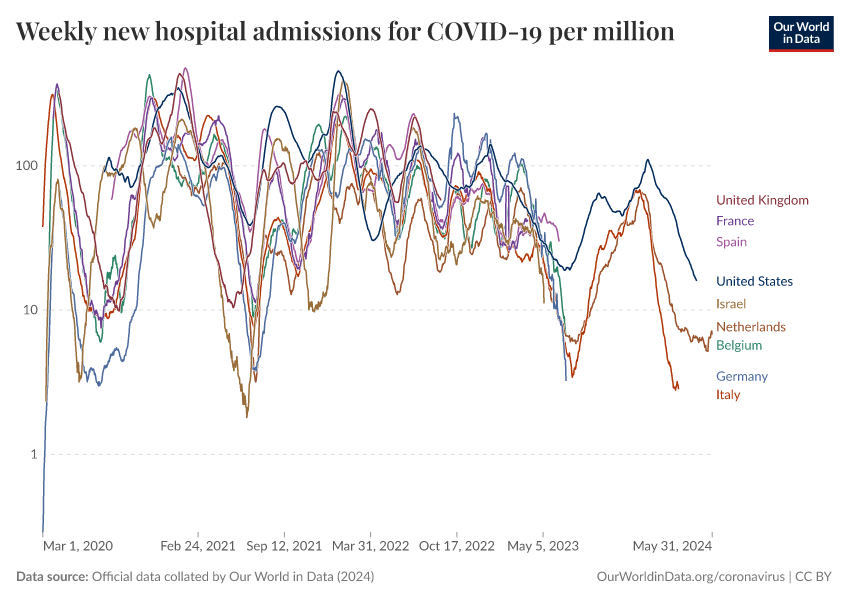 “Data Page: Weekly new hospital admissions for COVID-19 per million”, part of the following publication: Edouard Mathieu, Hannah Ritchie, Lucas Rodés-Guirao, Cameron Appel, Daniel Gavrilov, Charlie Giattino, Joe Hasell, Bobbie Macdonald, Saloni Dattani, Diana Beltekian, Esteban Ortiz-Ospina, and Max Roser (2020) - “COVID-19 Pandemic”. Data adapted from Official data collated by Our World in Data. Retrieved from https://archive.ourworldindata.org/20250909-093708/grapher/weekly-hospital-admissions-covid-per-million.html [online resource] (archived on September 9, 2025).