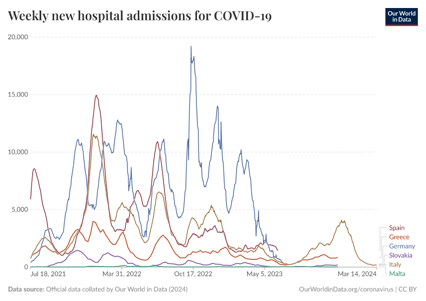 “Data Page: Weekly new hospital admissions for COVID-19”, part of the following publication: Edouard Mathieu, Hannah Ritchie, Lucas Rodés-Guirao, Cameron Appel, Daniel Gavrilov, Charlie Giattino, Joe Hasell, Bobbie Macdonald, Saloni Dattani, Diana Beltekian, Esteban Ortiz-Ospina, and Max Roser (2020) - “COVID-19 Pandemic”. Data adapted from Official data collated by Our World in Data. Retrieved from https://archive.ourworldindata.org/20250909-093708/grapher/weekly-hospital-admissions-covid.html [online resource] (archived on September 9, 2025).