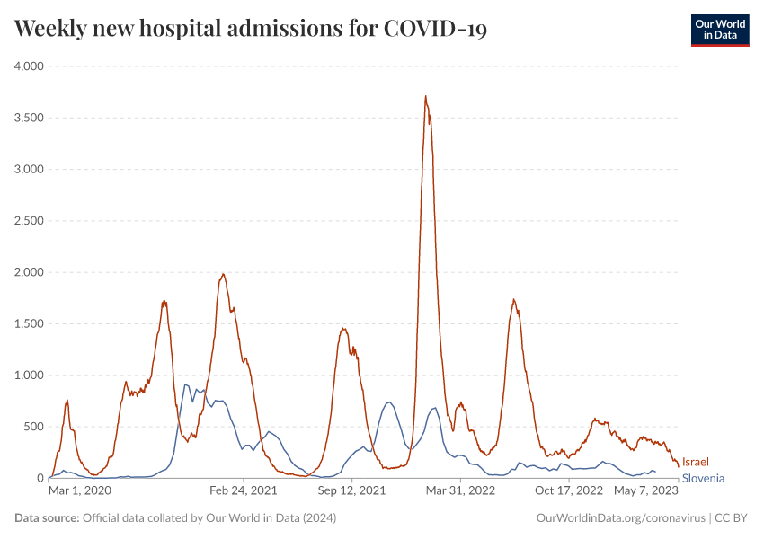 “Data Page: Weekly new hospital admissions for COVID-19”, part of the following publication: Edouard Mathieu, Hannah Ritchie, Lucas Rodés-Guirao, Cameron Appel, Daniel Gavrilov, Charlie Giattino, Joe Hasell, Bobbie Macdonald, Saloni Dattani, Diana Beltekian, Esteban Ortiz-Ospina, and Max Roser (2020) - “COVID-19 Pandemic”. Data adapted from Official data collated by Our World in Data. Retrieved from https://archive.ourworldindata.org/20250909-093708/grapher/weekly-hospital-admissions-covid.html [online resource] (archived on September 9, 2025).