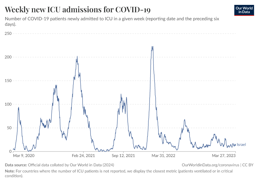 “Data Page: Weekly new ICU admissions for COVID-19”, part of the following publication: Edouard Mathieu, Hannah Ritchie, Lucas Rodés-Guirao, Cameron Appel, Daniel Gavrilov, Charlie Giattino, Joe Hasell, Bobbie Macdonald, Saloni Dattani, Diana Beltekian, Esteban Ortiz-Ospina, and Max Roser (2020) - “COVID-19 Pandemic”. Data adapted from Official data collated by Our World in Data. Retrieved from https://archive.ourworldindata.org/20250909-093708/grapher/weekly-icu-admissions-covid.html [online resource] (archived on September 9, 2025).