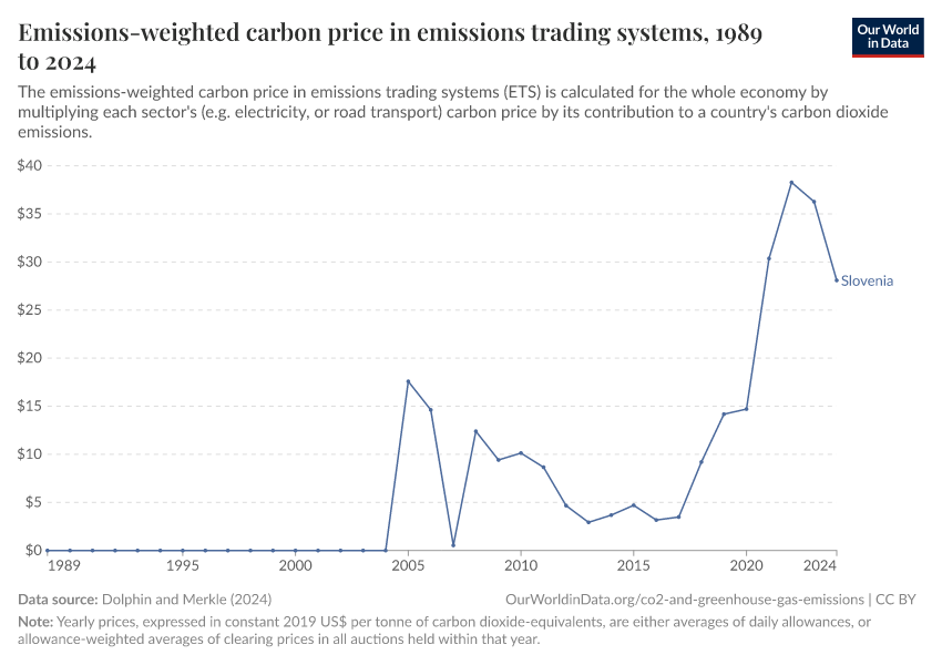 “Data Page: Emissions-weighted carbon price in emissions trading systems”, part of the following publication: Hannah Ritchie, Pablo Rosado, and Max Roser (2023) - “CO₂ and Greenhouse Gas Emissions”. Data adapted from Resources for the Future. Retrieved from https://archive.ourworldindata.org/20250909-093708/grapher/weighted-carbon-price-ets.html [online resource] (archived on September 9, 2025).How to cite this data