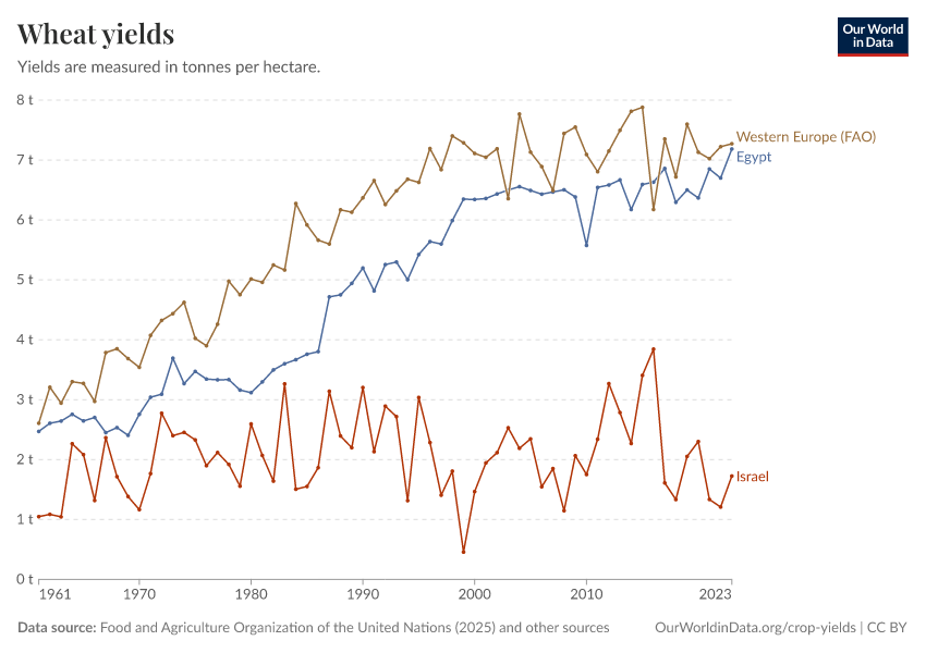 “Data Page: Wheat yields”, part of the following publication: Hannah Ritchie, Pablo Rosado, and Max Roser (2022) - “Crop Yields”. Data adapted from Food and Agriculture Organization of the United Nations, Broadberry et al., Brassley, Bayliss-Smith & Wanmali. Retrieved from https://archive.ourworldindata.org/20251014-161652/grapher/wheat-yields.html [online resource] (archived on October 14, 2025).How to cite this data