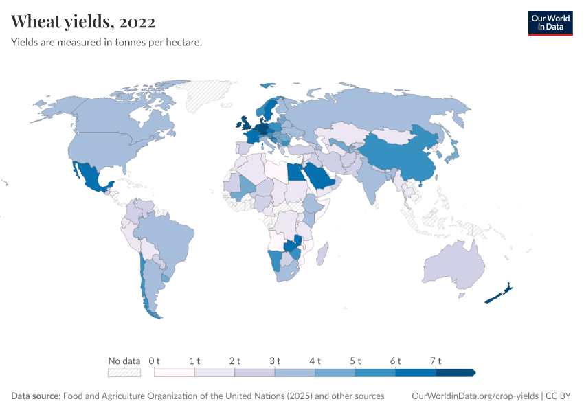 “Data Page: Wheat yields”, part of the following publication: Hannah Ritchie, Pablo Rosado, and Max Roser (2022) - “Crop Yields”. Data adapted from Food and Agriculture Organization of the United Nations, Broadberry et al., Brassley, Bayliss-Smith & Wanmali. Retrieved from https://archive.ourworldindata.org/20260116-143329/grapher/wheat-yields.html [online resource] (archived on January 16, 2026).How to cite this data