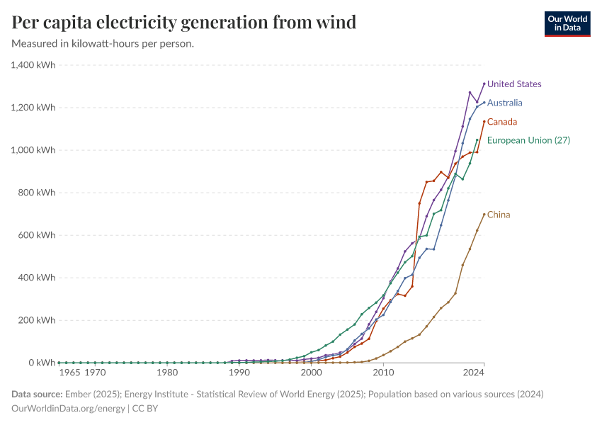 Ember (2025); Energy Institute - Statistical Review of World Energy (2025); Population based on various sources (2024) – with major processing by Our World in Data. “Electricity generation from wind power per person” [dataset]. Ember, “Yearly Electricity Data Europe”; Ember, “Yearly Electricity Data”; Energy Institute, “Statistical Review of World Energy”; Various sources, “Population” [original data]. Retrieved December 8, 2025 from https://archive.ourworldindata.org/20250925-233948/grapher/wind-electricity-per-capita.html (archived on September 25, 2025).