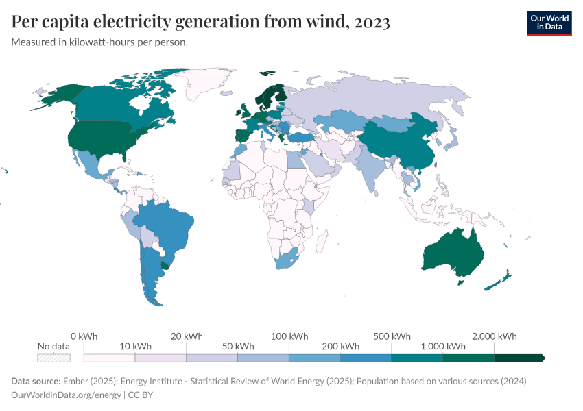 Ember (2025); Energy Institute - Statistical Review of World Energy (2025); Population based on various sources (2024) – with major processing by Our World in Data. “Electricity generation from wind power per person” [dataset]. Ember, “Yearly Electricity Data Europe”; Ember, “Yearly Electricity Data”; Energy Institute, “Statistical Review of World Energy”; Various sources, “Population” [original data]. Retrieved December 26, 2025 from https://archive.ourworldindata.org/20250925-233948/grapher/wind-electricity-per-capita.html (archived on September 25, 2025).