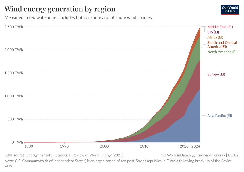 Energy Institute - Statistical Review of World Energy (2025) – with major processing by Our World in Data. “Electricity generation from wind power” [dataset]. Energy Institute, “Statistical Review of World Energy” [original data]. Retrieved December 5, 2025 from https://archive.ourworldindata.org/20250909-093708/grapher/wind-energy-consumption-by-region.html (archived on September 9, 2025).