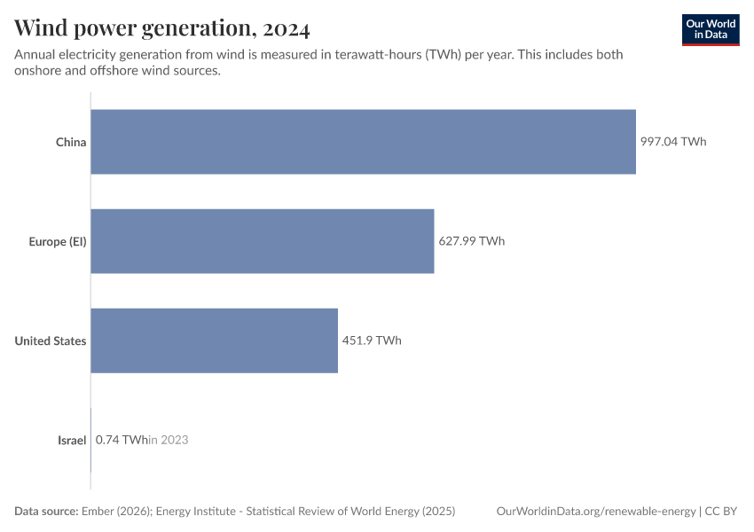 Ember (2026); Energy Institute - Statistical Review of World Energy (2025) – with major processing by Our World in Data. “Electricity generation from wind power” [dataset]. Ember, “Yearly Electricity Data Europe”; Ember, “Yearly Electricity Data”; Energy Institute, “Statistical Review of World Energy” [original data]. Retrieved January 29, 2026 from https://archive.ourworldindata.org/20260128-110227/grapher/wind-generation.html (archived on January 28, 2026).