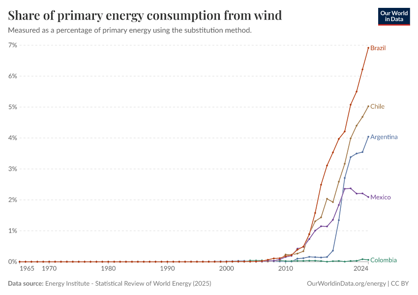 Energy Institute - Statistical Review of World Energy (2025) – with major processing by Our World in Data. “Share of primary energy consumption that comes from wind power – Using the substitution method” [dataset]. Energy Institute, “Statistical Review of World Energy” [original data]. Retrieved January 16, 2026 from https://archive.ourworldindata.org/20250909-093708/grapher/wind-share-energy.html (archived on September 9, 2025).