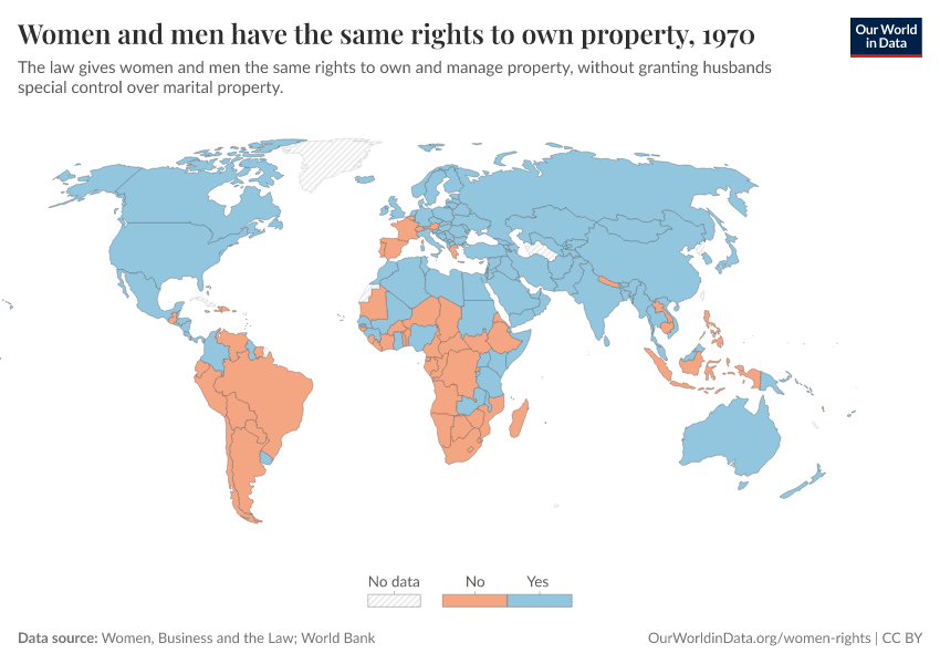 “Data Page: Women and men have the same rights to own property”, part of the following publication: Bastian Herre, Veronika Samborska, Pablo Arriagada, and Hannah Ritchie (2023) - “Women’s Rights”. Data adapted from World Bank Gender Statistics. Retrieved from https://archive.ourworldindata.org/20250916-204433/grapher/women-and-men-have-equal-rights-to-immovable-property.html [online resource] (archived on September 16, 2025).
