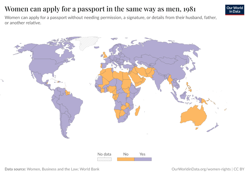 “Data Page: Women can apply for a passport in the same way as men”, part of the following publication: Bastian Herre, Veronika Samborska, Pablo Arriagada, and Hannah Ritchie (2023) - “Women’s Rights”. Data adapted from World Bank Gender Statistics. Retrieved from https://archive.ourworldindata.org/20250916-204433/grapher/women-can-apply-passport-same-as-men.html [online resource] (archived on September 16, 2025).How to cite this data