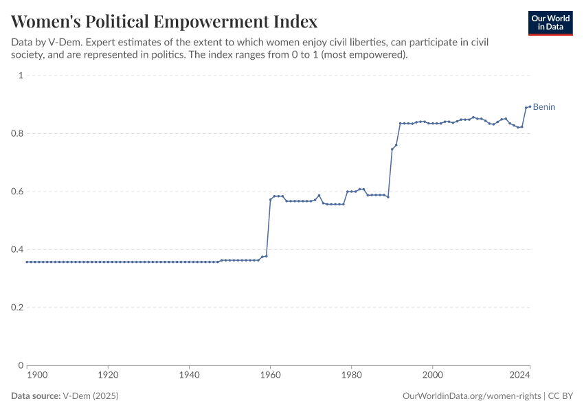 “Data Page: Women's political empowerment index”, part of the following publication: Bastian Herre, Lucas Rodés-Guirao, and Esteban Ortiz-Ospina (2013) - “Democracy”. Data adapted from V-Dem. Retrieved from https://archive.ourworldindata.org/20260105-133053/grapher/women-political-empowerment-index.html [online resource] (archived on January 5, 2026).How to cite this data