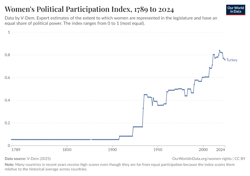 “Data Page: Women's political participation index”, part of the following publication: Bastian Herre, Lucas Rodés-Guirao, and Esteban Ortiz-Ospina (2013) - “Democracy”. Data adapted from V-Dem. Retrieved from https://archive.ourworldindata.org/20260105-133053/grapher/women-political-participation-index.html [online resource] (archived on January 5, 2026).How to cite this data