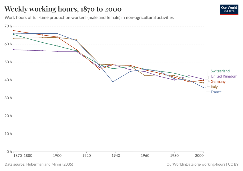 “Data Page: Weekly working hours”, part of the following publication: Charlie Giattino, Esteban Ortiz-Ospina, and Max Roser (2020) - “Working Hours”. Data adapted from Huberman and Minns. Retrieved from https://archive.ourworldindata.org/20250909-093708/grapher/work-hours-per-week.html [online resource] (archived on September 9, 2025).How to cite this data