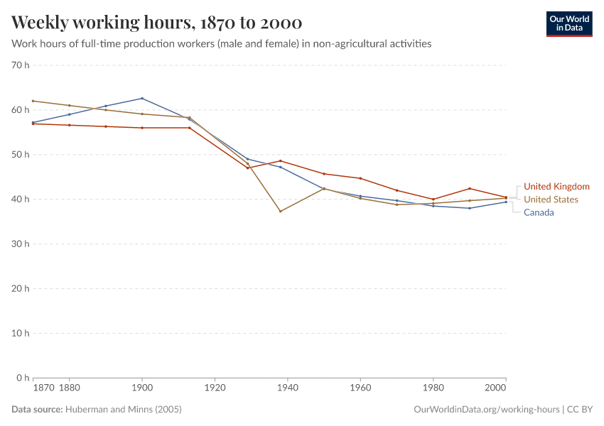 Huberman and Minns (2005) – with major processing by Our World in Data. “Weekly working hours – Huberman and Minns” [dataset]. Huberman and Minns, “Working hours (Huberman and Minns, 2005)” [original data]. Retrieved January 2, 2026 from https://archive.ourworldindata.org/20250909-093708/grapher/work-hours-per-week.html (archived on September 9, 2025).