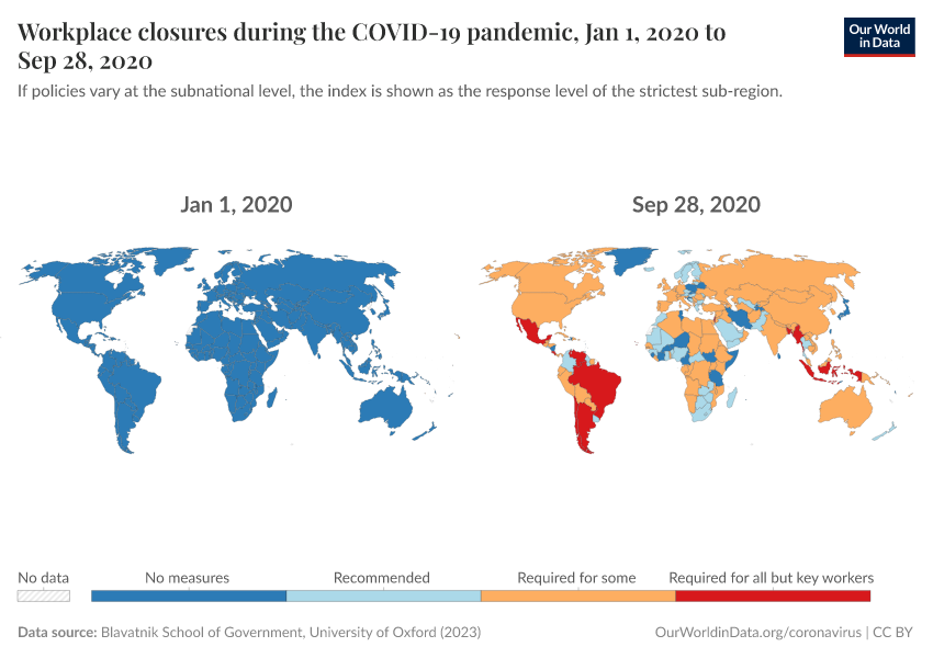 Blavatnik School of Government, University of Oxford (2023) – with minor processing by Our World in Data. “Workplace closures during the COVID-19 pandemic” [dataset]. Blavatnik School of Government, University of Oxford, “Government Response Tracker (OxCGRT)” [original data]. Retrieved December 22, 2025 from https://archive.ourworldindata.org/20250909-093708/grapher/workplace-closures-covid.html (archived on September 9, 2025).