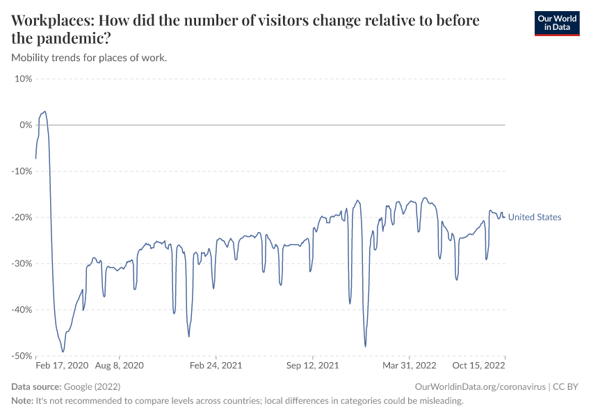 Google (2022) – with minor processing by Our World in Data. “Workplaces: How did the number of visitors change relative to before the pandemic?” [dataset]. Google, “COVID-19, Community Mobility Reports” [original data]. Retrieved December 16, 2025 from https://archive.ourworldindata.org/20250909-093708/grapher/workplace-visitors-covid.html (archived on September 9, 2025).