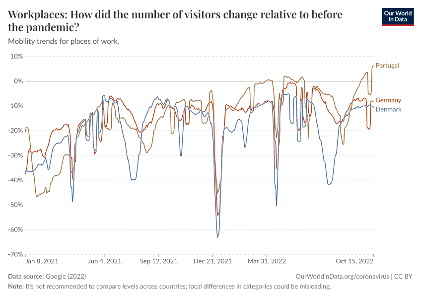 Google (2022) – with minor processing by Our World in Data. “Workplaces: How did the number of visitors change relative to before the pandemic?” [dataset]. Google, “COVID-19, Community Mobility Reports” [original data]. Retrieved March 15, 2026 from https://archive.ourworldindata.org/20260304-094028/grapher/workplace-visitors-covid.html (archived on March 4, 2026).