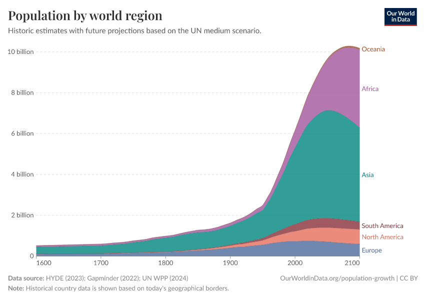 “Data Page: Population by world region”, part of the following publication: Hannah Ritchie, Lucas Rodés-Guirao, Edouard Mathieu, Marcel Gerber, Esteban Ortiz-Ospina, Joe Hasell, and Max Roser (2023) - “Population Growth”. Data adapted from PBL Netherlands Environmental Assessment Agency, Gapminder, United Nations. Retrieved from https://archive.ourworldindata.org/20250929-103213/grapher/population-regions-with-projections.html [online resource] (archived on September 29, 2025).