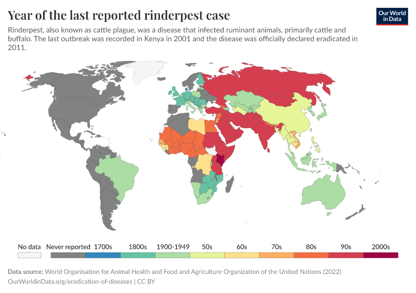 World Organisation for Animal Health and Food and Agriculture Organization of the United Nations (2022) – processed by Our World in Data. “Year of the last reported rinderpest case” [dataset]. World Organisation for Animal Health and Food and Agriculture Organization of the United Nations, “Rinderpest and its Eradication” [original data]. Retrieved December 8, 2025 from https://archive.ourworldindata.org/20250909-093708/grapher/year-of-the-last-reported-rinderpest-case.html (archived on September 9, 2025).