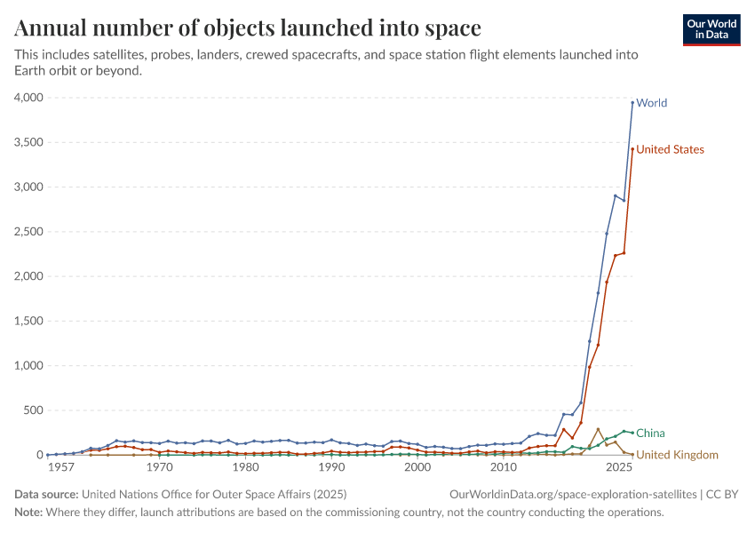 United Nations Office for Outer Space Affairs (2025) – with major processing by Our World in Data. “Annual number of objects launched into space – UNOOSA” [dataset]. United Nations Office for Outer Space Affairs, “Online Index of Objects Launched into Outer Space” [original data]. Retrieved January 29, 2026 from https://archive.ourworldindata.org/20260109-090050/grapher/yearly-number-of-objects-launched-into-outer-space.html (archived on January 9, 2026).