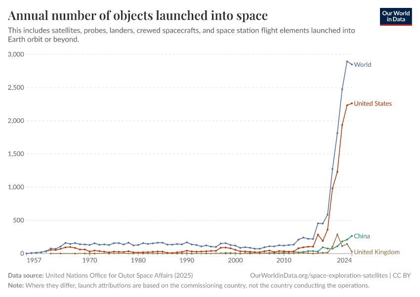 United Nations Office for Outer Space Affairs (2025) – with major processing by Our World in Data. “Annual number of objects launched into space – UNOOSA” [dataset]. United Nations Office for Outer Space Affairs, “Online Index of Objects Launched into Outer Space” [original data]. Retrieved December 18, 2025 from https://archive.ourworldindata.org/20250909-093708/grapher/yearly-number-of-objects-launched-into-outer-space.html (archived on September 9, 2025).