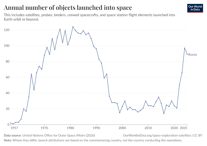 United Nations Office for Outer Space Affairs (2026) – with major processing by Our World in Data. “Annual number of objects launched into space – UNOOSA” [dataset]. United Nations Office for Outer Space Affairs, “Online Index of Objects Launched into Outer Space” [original data]. Retrieved April 15, 2026 from https://archive.ourworldindata.org/20260304-094028/grapher/yearly-number-of-objects-launched-into-outer-space.html (archived on March 4, 2026).Download