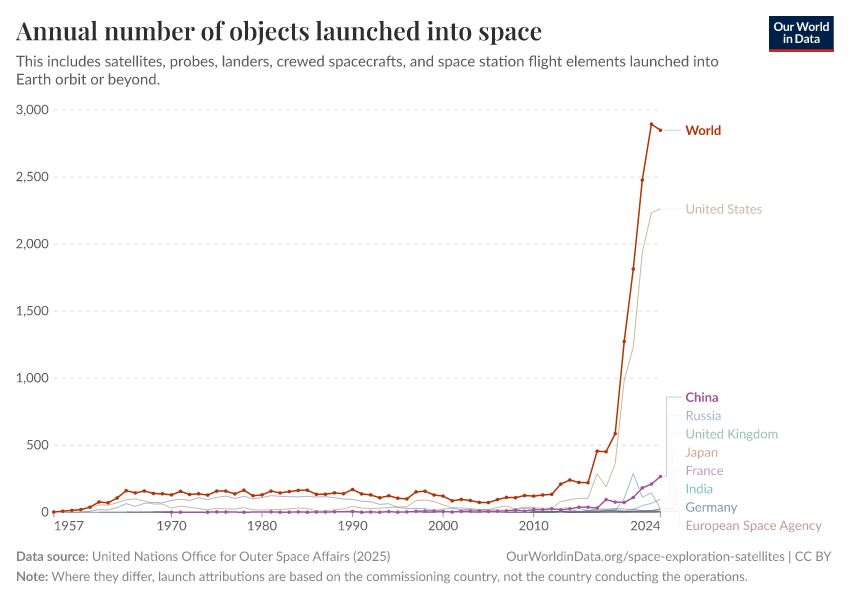 United Nations Office for Outer Space Affairs (2025) – with major processing by Our World in Data. “Annual number of objects launched into space – UNOOSA” [dataset]. United Nations Office for Outer Space Affairs, “Online Index of Objects Launched into Outer Space” [original data]. Retrieved December 6, 2025 from https://archive.ourworldindata.org/20250909-093708/grapher/yearly-number-of-objects-launched-into-outer-space.html (archived on September 9, 2025).