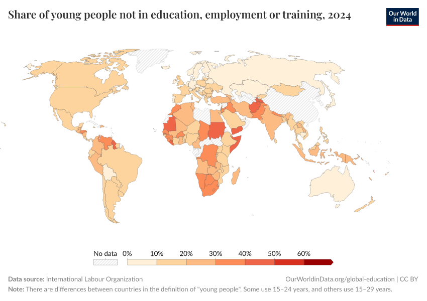 “Data Page: Share of young people not in education, employment or training”. Our World in Data (2025). Data adapted from International Labour Organization. Retrieved from https://archive.ourworldindata.org/20251125-165536/grapher/youth-not-in-education-employment-training.html [online resource] (archived on November 25, 2025).How to cite this data