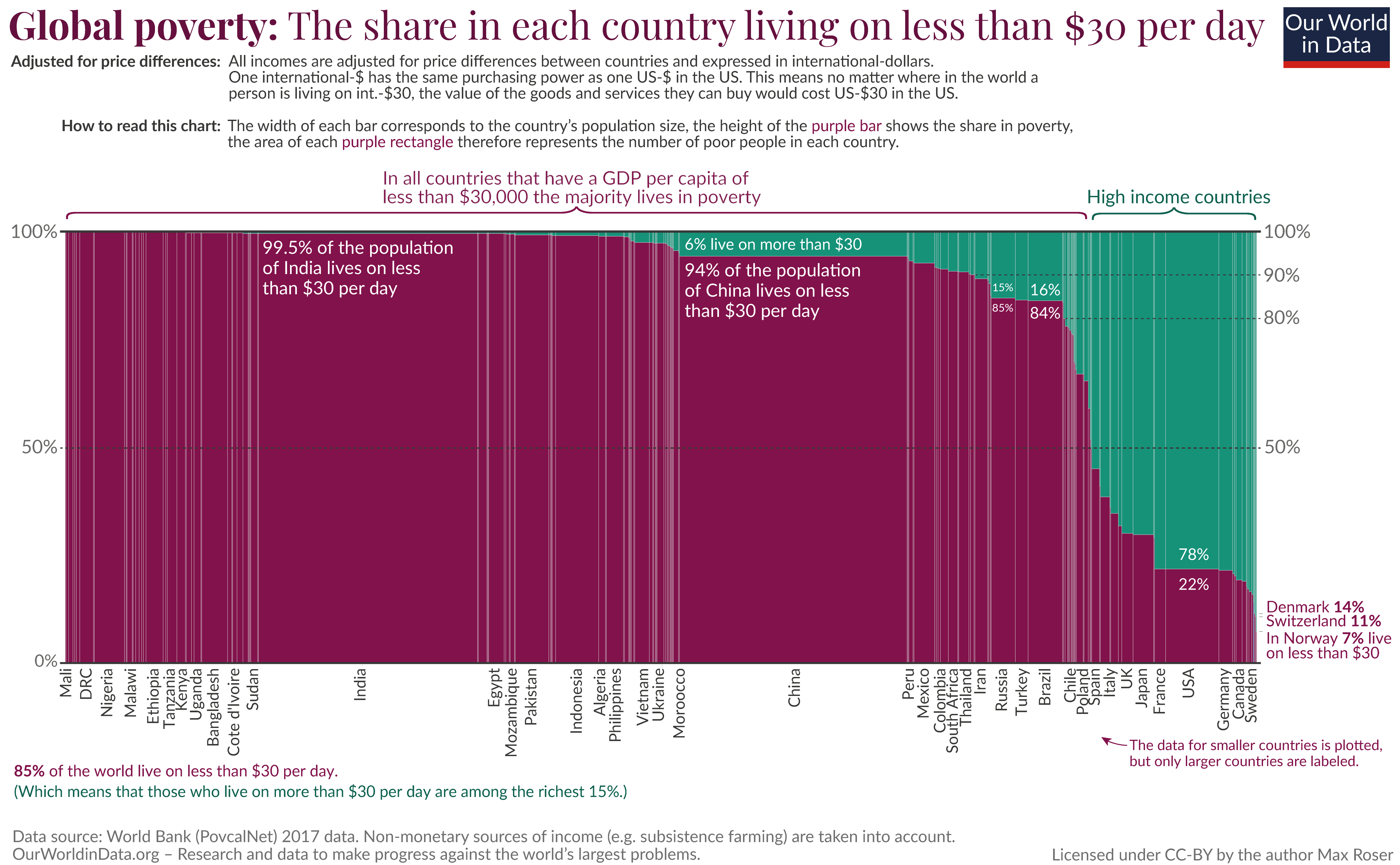 Taking into account the different price levels across countries, the latest statistics show that 85% of the world population live below this poverty line. This large visualization shows where they live. The height of the purple bar corresponds to the share in poverty in each country.